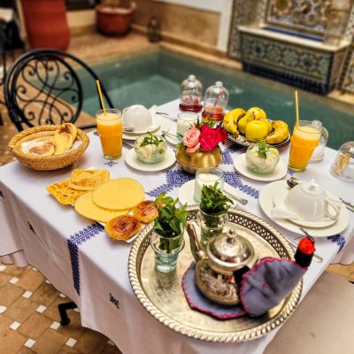 Te ofrecemos una cocina delicada y generosa. Nuestra cocinera, te preparará un desayuno y una cocina tradicional marroquí con productos frescos del mercado. No dudes en reservar tu tajín o cuscús. El desayuno, te permitirá comenzar tu día con energía para recorrer las calles de la Ciudad Roja.